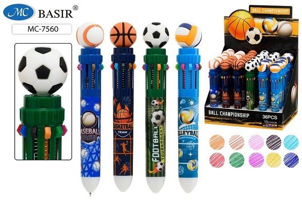 Авторучка 10-ти цветная: детская; "СПОРТ"; цветной корпус с рисунком /ассорти/,клип в форме мяча..0.5 mm.