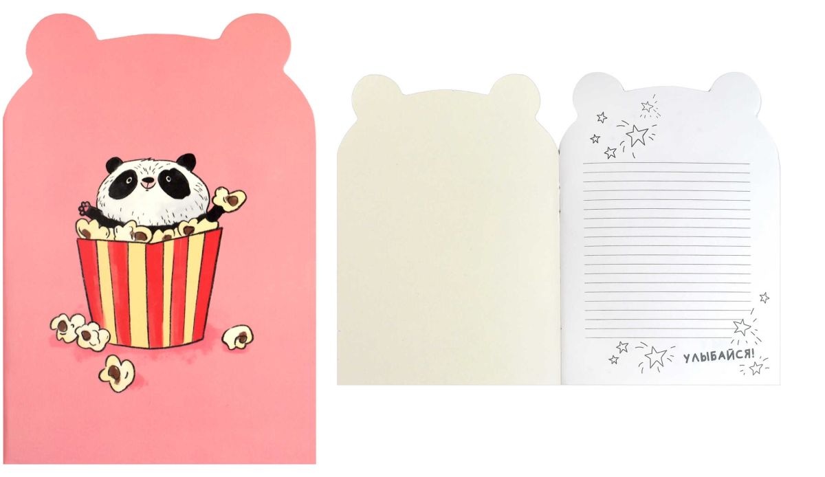 Блокнот 32л арт. 70413/ПАНДА С ПОП-КОРНОМ /120х170 мм, фигурная вырубка, вн.блок - белый офсет, линия. Обложка - мелованный картон 190 г/м², матовая ламинация