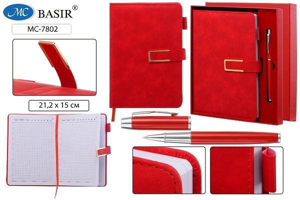 Ежедневник+металлическая ручка в подарочной упаковке: материал кожезаменитель под нубук, красный цвет, металлическая застёжка на магните, справочная информация; блок-1 офсет, клетка; 116 листов, 14,5*21 см.