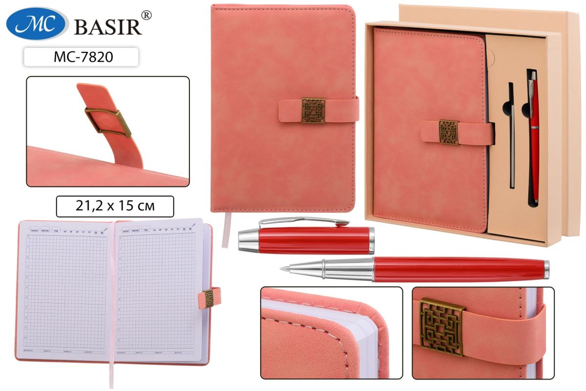 Ежедневник+металлическая ручка+запасной стержень в подарочной упаковке: материал кожезаменитель под нубук, розовый цвет, металлическая застёжка на магните, справочная информация; блок-1 офсет, клетка; 116 листов, 14,5*21 см