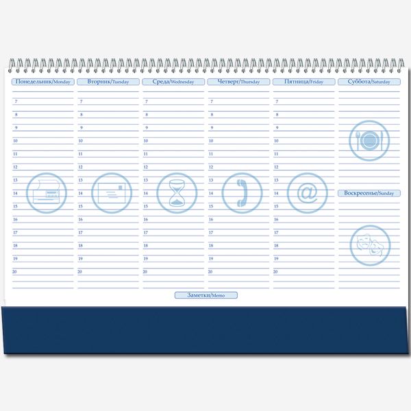 Еженедельник-планинг настольный, 490х350, недатированный, блок – офсет 80 г/м кв., печать в одну краску, прижимной клапан (синий бумвинил) снизу, на металлическом гребне, индивидуальная упаковка.