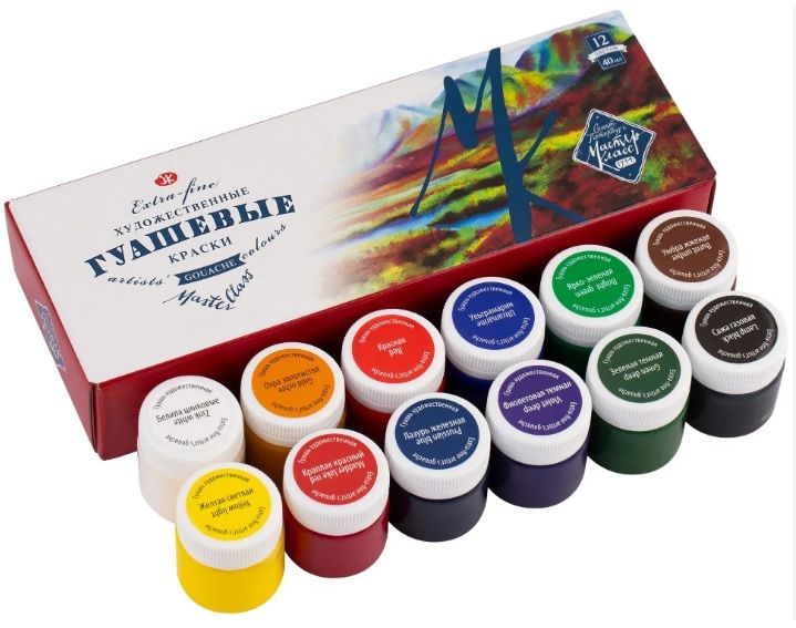 Художественная гуашь «Мастер-класс» изготавливается на основе высококачественных пигментов натурального гуммиарабика, являющегося лучшим пленкообразующим компонентом для водоразбавляемых красок. Благодаря тщательно подобранным компонентам гуашевые краски «Мастер-Класс» идеальны для живописных, декоративных работ и графики. Обладают высокой укрывистостью, хорошо смешиваются между собой. Легко наносятся на бумагу, картон и грунтованный холст. При высыхании приобретают матовую бархатистую поверхность, легко размываются водой. Сбалансированная палитра из 12 базовых цветов в наборе «Мастер-Класс» позволяет решить множество творческих задач художника.