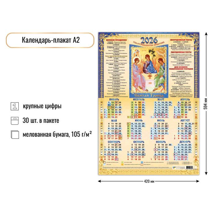 Размер: 420×594 мм, Материал мелованная бумага, 105 г/м2. Крупная сетка. В пакете 30 шт. Отмечены Посты и трапезы в праздники!