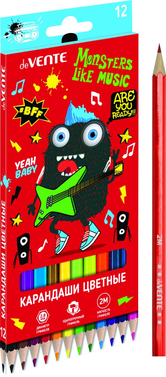 Карандаши цветные 'deVENTE. Monsters Like Music' 12 цветов, 2М, диаметр грифеля 2,8 мм, шестигранные, в картонной коробке