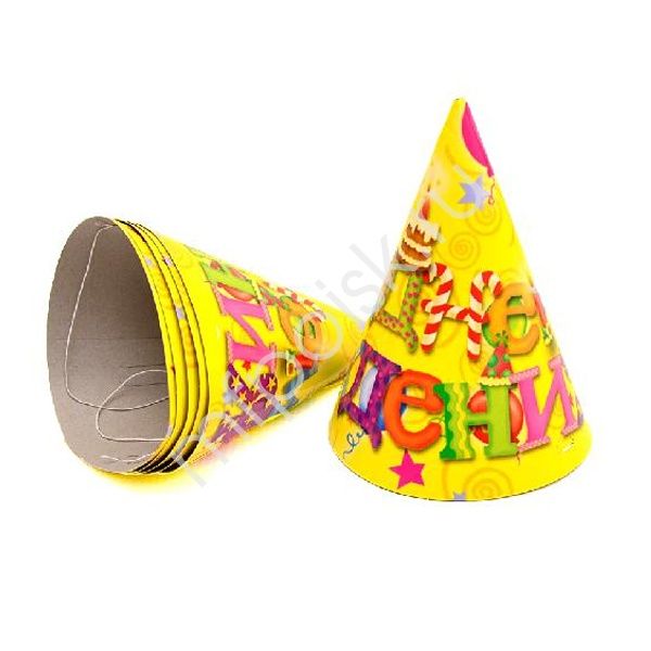 Колпачок из плотного картона - карнавальный головной убор. Данный колпачок является карнавальным аксессуаром коллекции праздничной одноразовой посуды "С Днем Рождения Русская версия". В упаковке содержится шесть карнавальных колпачков одного дизайна.