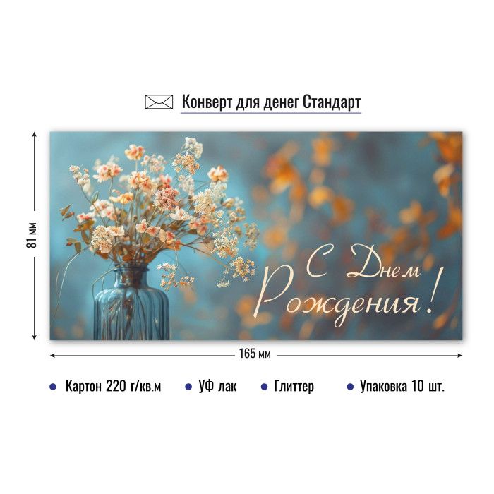 Конверты для денег стандарт формата 164×81 мм, материал: картон плотностью 210 г/кв.м. Обработка: УФ-лак, глиттер. Упакованы по 10 штук одного вида.