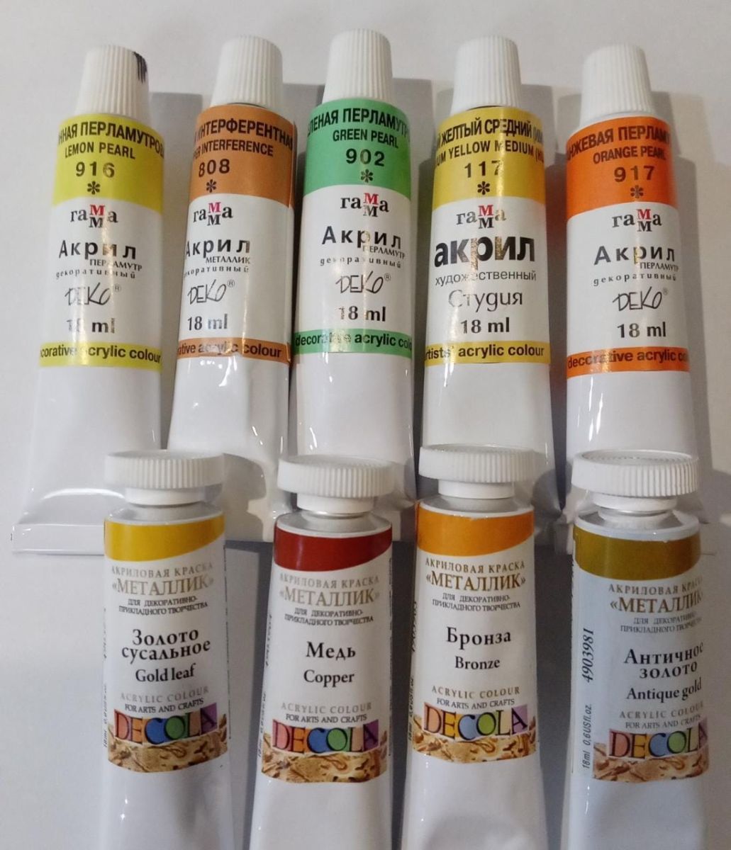 Краски акриловые DECOLA металлик по 18 мл в тубах. Краски прекрасно ложатся на различные поверхности: дерево, металл, кожу, грунтованный холст, бумагу, картон. Применяются при художественных и декоративных работах. Краски имеют высокую концентрацию пигментов, что позволяет достичь отличных покрывных свойств. Хорошо смешиваются между собой, быстро высыхают, не растрескиваются. После высыхания дают эластичную яркую глянцевую пленку. Можно наносить как в пастозной консистенции, так и предварительно разбавлять водой. Не требуют закрепления лаками и закрепителями. Не токсичны, не имеют запаха.
