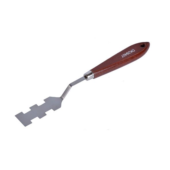Инструмент с деревянной ручкой и стальным шпателем. Шпатель прямоугольной формы с пятью средними выемками по краям. Ручка мастихина изготовлена из бука, тонированного морилкой 'темный орех', имеет отверстие для подвешивания. Используется для смешивания и нанесения краски. Подходит для создания фактурных эффектов.