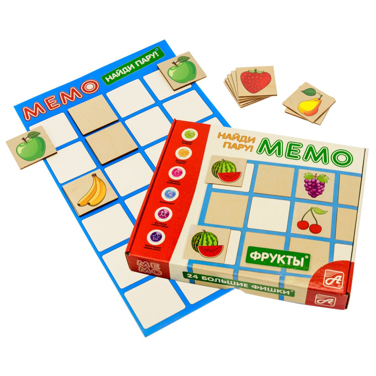 'МЕМО. Найди пару! Фрукты' - настольная развивающая игра, направленная на развитие памяти и внимательности ребенка. Игра рассчитана на 1-3 игроков. На специальном игровом поле раскладываются фишки с изображениями фруктов. Затем, по очереди, каждый игрок переворачивает по две фишки таким образом, чтобы все могли видеть изображенные на них картинки. Если изображения одинаковые, то игрок забирает их, и они убираются с поля. Если картинки не совпадают, то игрок возвращает фишки картинками вниз на игровое поле. Выигрывает тот, кто к концу игры наберет большее количество парных фишек. В состав игры входят 24 деревянные фишки с изображениями фруктов, игровое поле из картона.