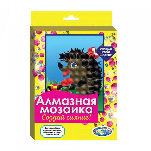 Набор для творчества Centrum алмазная мозаика "Ежик" позволит самостоятельно освоить технику алмазной живописи. Готовая работа несомненно вызовет восторг. Оригинальная картина, выложенная сверкающими кристаллами выглядит эффектно за счет блеска и объема. Мерцающая огранка кристаллов не тускнеет со временем.Набор подразумевает частичную выкладку страз. Процесс создания абсолютно не сложен, не требует особых навыков и умений. Необходимо наносить стразы на основу в соответствии с нумерацией. Набор включает все необходимые материалы: готовую основу с нанесенным клеем, пластиковые круглые стразы, упакованные в пронумерованные пакетики, пластиковый стилус, клей и емкость для страз. Размер: 20*15 см.