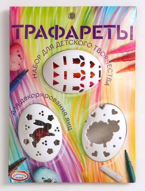 Детский набор с красителями и трафаретами для раскрашивания пасхальных яиц. Просто наложите трафарет на яйцо и раскрасьте картинку с помощью пищевых фломастеров. Разнообразие фломастеров позволит создать яркие образы и порадует каждого.