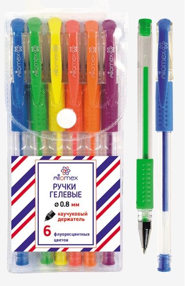 Набор ручек гелевых 'Attomex' 06 флуоресцентных цветов, d=0,8 мм, прозрачный корпус с металлическим наконечником и каучуковым держателем, сменный стержень, в пластиковом блистере
