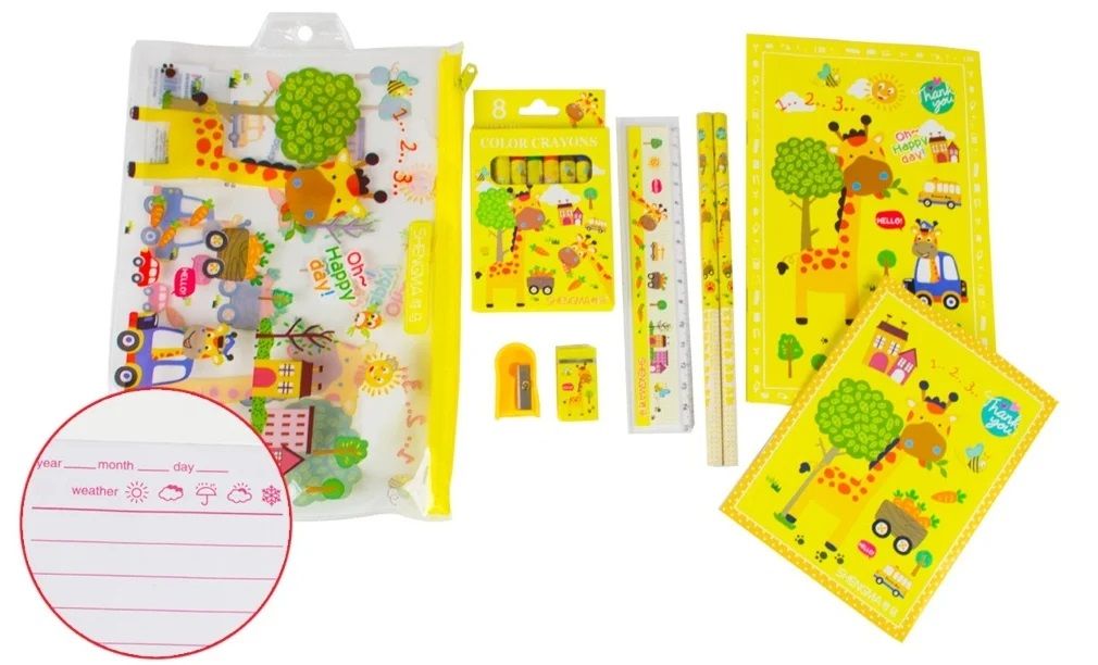 Набор канцелярский HAPPY DAY, в комплекте: блокнот с линованным внутренним блоком, блокнот с нелинованным внутренним блоком, 2 чернографитных карандаша (НВ), точилка, ластик, линейка, 8 восковых мелков, 4 дизайна, упаковка - ПВХ-пакет