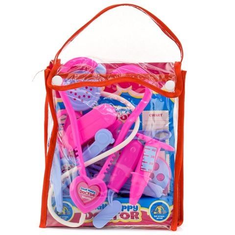 Набор доктора — стетоскоп, ножницы, очки, лампа, шприц, пинцет, термометр, ванночка для дезинфекции, скальпель, ложечка, планшет и тонометр. Игрушки выполнены из качественного пластика.