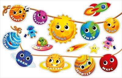 Оформительский набор «Космос» — это яркий декор для дома, детского сада и школы. В комплект входят: вырубные украшения (солнце, планеты, космонавты, ракета, комета, звезда, НЛО), двусторонний скотч и атласная лента длиной 2 метра. Все детали можно закрепить на стене при помощи скотча. Также можно собрать солнце и планеты в эффектную гирлянду. Для этого необходимо продеть атласную ленту в отверстия на деталях.