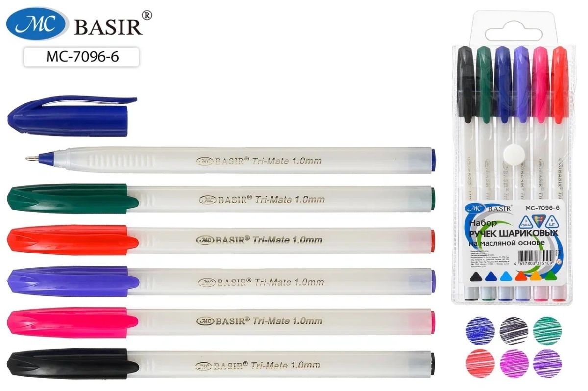 Набор шариковых ручек с чернилами на масляной основе: белый корпус, форма корпуса треугольная, цветной колпачок, в пластиковой упаковке на кнопке с европодвесом; 1 mm, 6 цветов.