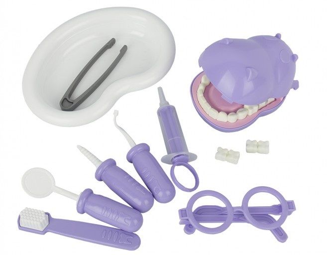 Комплектация набора : бегемот, ванночка, пинцет, сверло, крючок, зеркало, шприц, очки, зубная щетка.