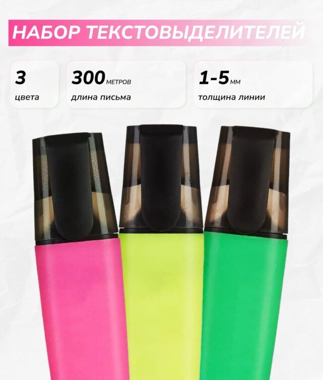 Набор состоит из трёх ярких цветов: жёлтого, зелёного и розового. Благодаря специальной формуле текстовыделители мягко ложатся на бумагу, не просвечивают и создают насыщенный цвет. Это позволяет использовать их для оформления конспектов, планирования задач, создания заметок и подчёркивания важных моментов в документах.