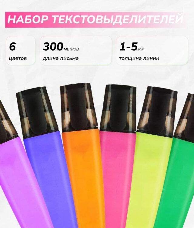 Набор состоит из шести ярких цветов: жёлтого, зелёного, оранжевого, фиолетового, синего и розового. Благодаря специальной формуле текстовыделители мягко ложатся на бумагу, не просвечивают и создают насыщенный цвет. Это позволяет использовать их для оформления конспектов, планирования задач, создания заметок и подчёркивания важных моментов в документах.