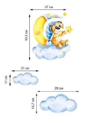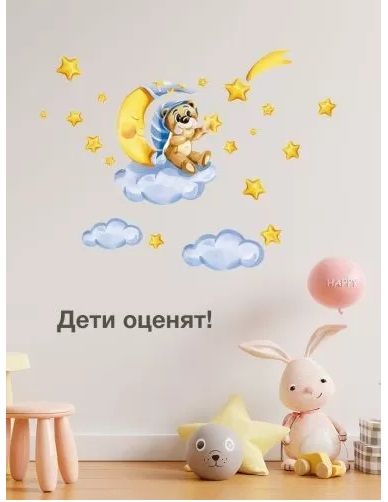 Яркие оформительские наклейки помогут с легкостью преобразить интерьер комнаты. Очаровательный набор «Мишка на месяце» включает 19 стикеров. Милые забавные иллюстрации и безопасные материалы делают наклейки идеальным украшением для детской комнаты или уголка. Дети и их родители будут в полном восторге! Наклейки изготовлены из ПВХ. На виниловой основе отпечатано яркое полноцветное изображение. Рисунок отделан глянцевым УФ-лаком. Наклейки не боятся влаги и легко моются. Можно переклеивать с места на место. Таким образом можно менять композицию и создавать новые конфигурации. Набор наклеек отлично подойдет для дома, школы, детского сада. Наклейки поставляются на подложке формата А2.