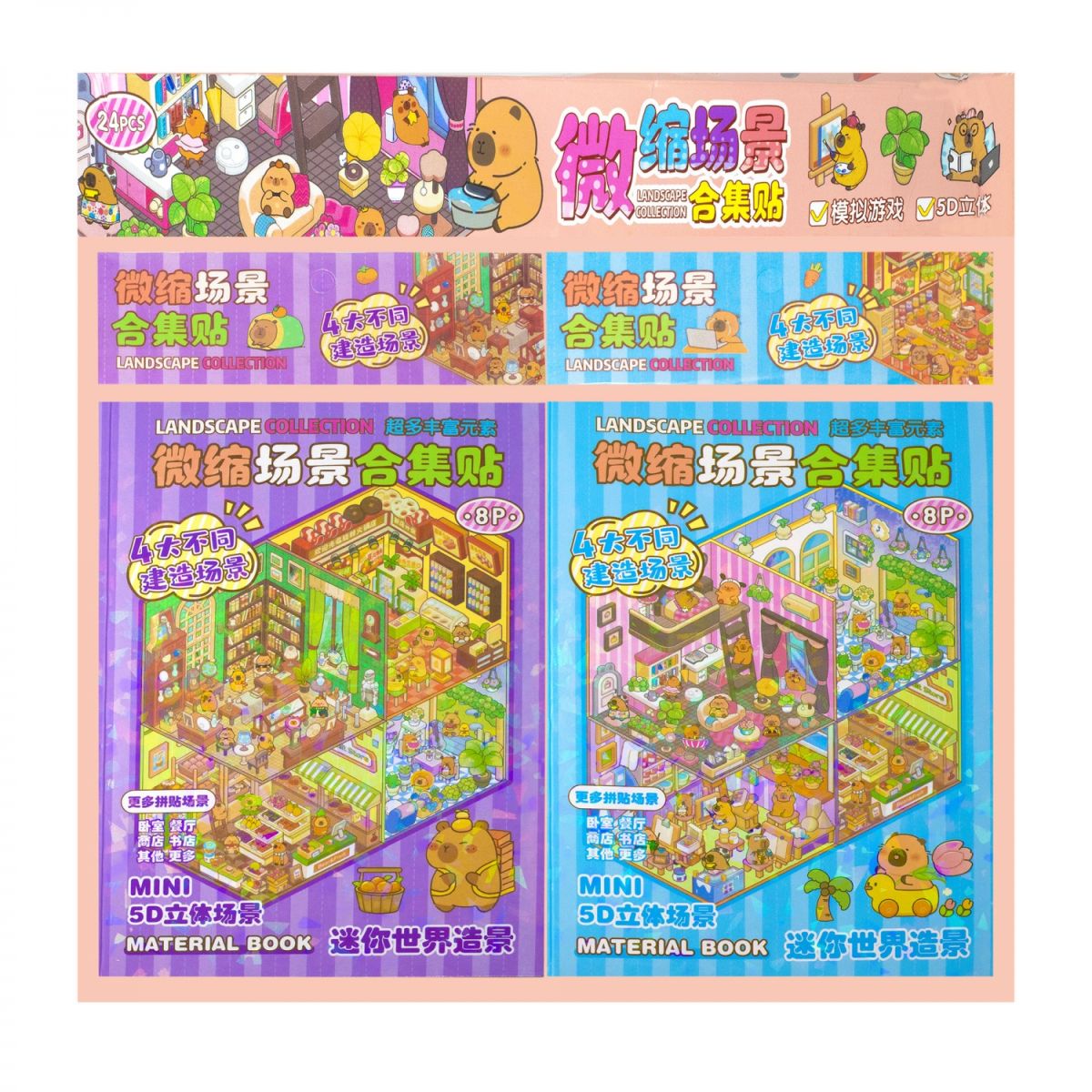 Наклейки для творчества - антистресс набор, 135*195 мм, "MIX CAPYBARA", MINI, 5D стикеры, 4 комнаты, 4 листа с наклейками, 24 шт/уп, шоу-бокс