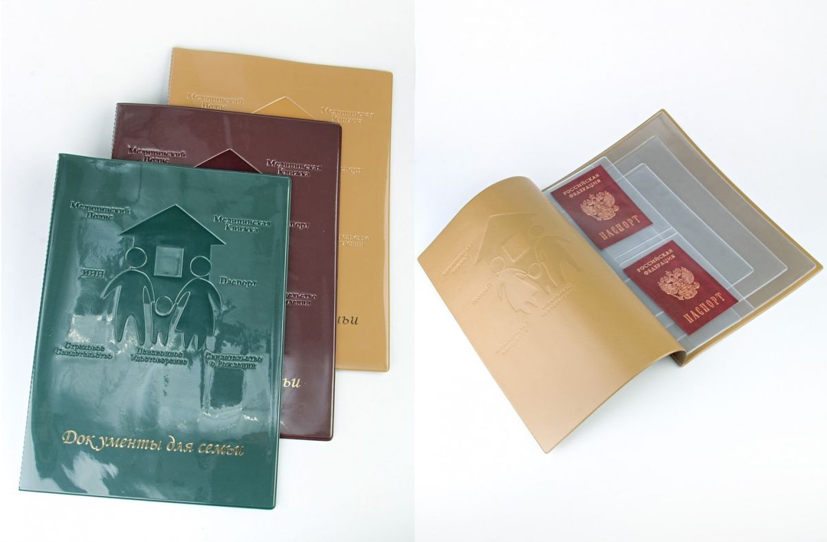 Папка для семейных документов выполнена из мягкого ПВХ, благодаря чему ее можно легко скрутить и положить в сумку, не боясь повреждения документов. Внутри: серая пленка дублер и прозрачные файлы: А4- формата -2шт.; А5-формата -1шт.; 1 файл - под свидетельство о регистрации брака или такого размера документ (260*190 мм), 2-файла (142*85мм), 1 файл (121*90 мм), 3 файла размером на пластиковые карточки (Карта Москвича, страховой и т.п.).