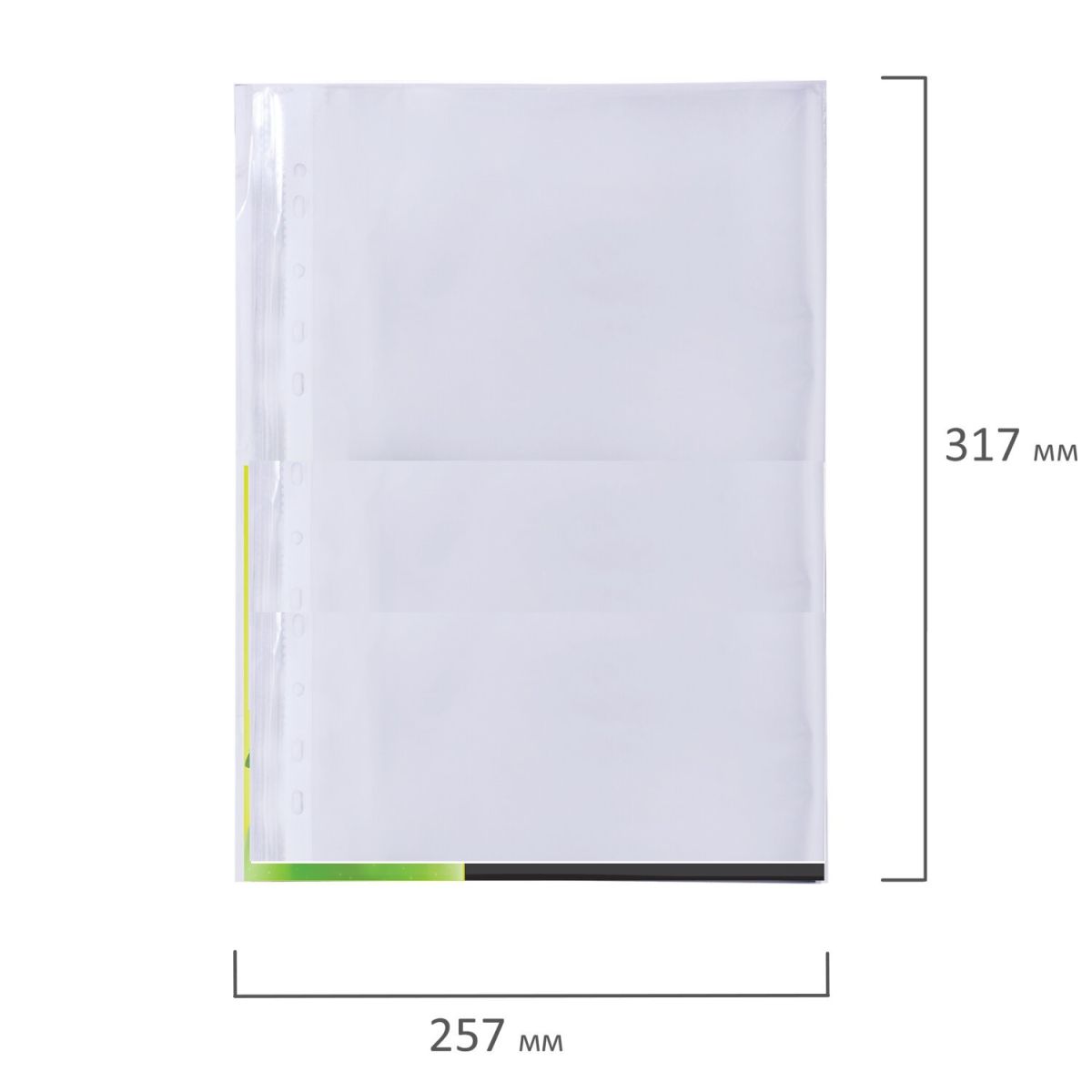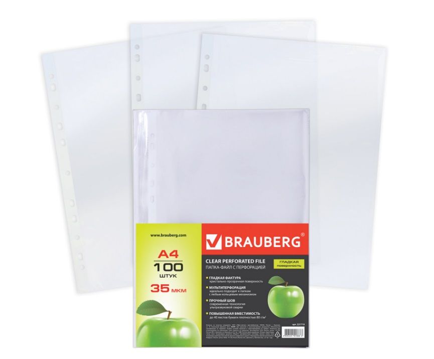 Папки-файлы формата А4 с вертикальным размещением содержат универсальную перфорацию, а имеют гладкую поверхность и прочные швы. Толщина пленки - 35 мкм.Вместимость до 40 листов. В комплекте 100 шт.