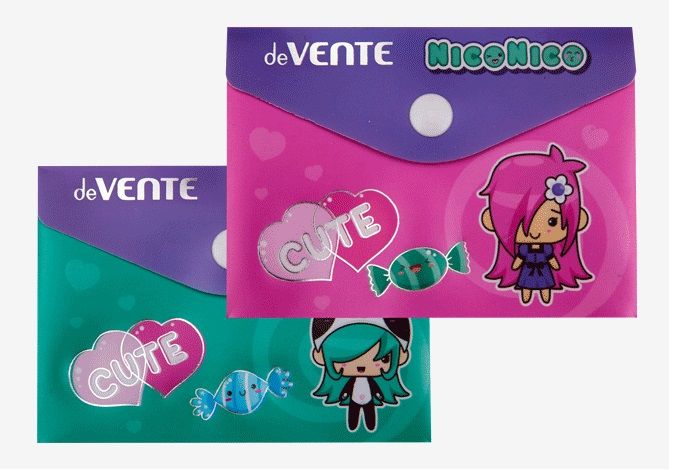 Папка-конверт на кнопке "deVENTE. NicoNico:-)" A7 (105x74 мм) 180 мкм, непрозрачная с рисунком, тиснение фольгой, индивидуальная маркировка, 2 дизайна ассорти
