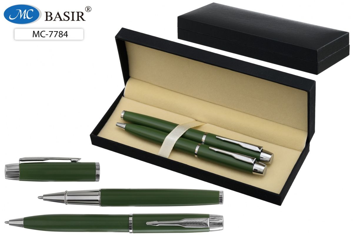 Подарочный набор: 2 металлические ручки ( с поворотным механизмом и ручка с колпачком), объёмный зелёный корпус с элементами серебра; цвет чернил-синий; подарочный футляр.