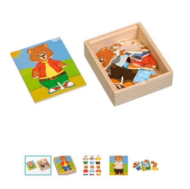 будет интересна девочкам и мальчикам 2-4 лет. Она представляет собой пазл из дерева, цель которого - собрать медвежонка из трех элементов. В комплекте шесть мордочек с разными выражениями, шесть кофточек и шесть брюк. Простор для фантазии ребенка - комбинировать эти элементы на свое усмотрение, создавая для Миши десятки разных образов. Деревянная игрушка развивает внимательность и чувство стиля - с подсказками родителей ребенок постепенно узнает, что с чем сочетается, какие цвета смотрятся наиболее гармонично. В процессе игры обращайте внимание ребенка на выражения лица мишки, попросите найти, например, радостное или сердитое. Детали хранятся в изящной деревянной коробке, там же на крышке и собираются.