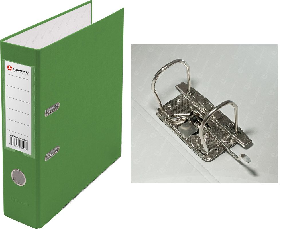 Папка-регистратор LAMARK РР с арочным механизмом изготовлена из плотного картона, с внешней стороны заламинированного полипропиленовой пленкой (РР) с текстурой 'лен', внутри оклеена бумагой с алфавитно-цифровым полем для классификации на левой стороне. Прорези на крышке удерживают папку закрытой даже при большом количестве документов. Ширина корешка 80 мм. Вместимость до 480 листов формата А4. Нижние края защищены металлическим кантом, что сохраняет папку при длительной интенсивной эксплуатации. Карман со сменной индексной вставкой на корешке. Цвет светло-зеленый. Поставляются в собранном виде.