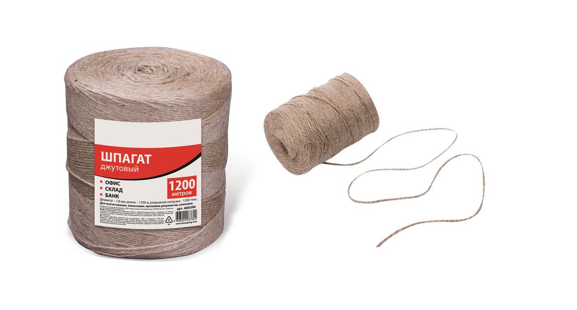 Шпагат джутовый банковский, полированный, длина 1200м, диам. 1,8мм, лин.пл.1200текс, 600396