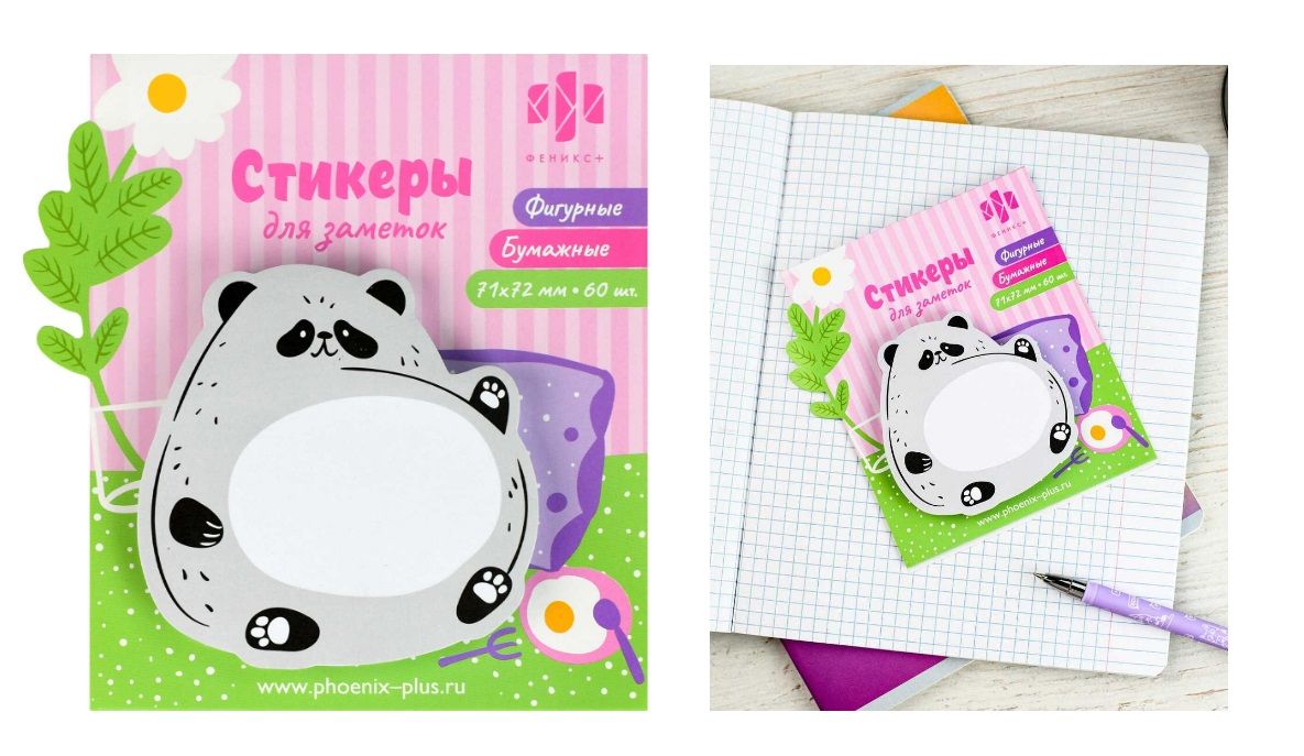 Стикеры для заметок бумажные, 71х72 мм, 60 шт., арт. 65166 / 25 ПАНДА (материал: бумага 80 г/м², цвет: белый, серый; форма: фигурная, декор: полноцветная печать; наличие диспенсера: нет, индивидуальная упаковка: подложка из мелованного картона + ПЭТ-пакет с европодвесом)
