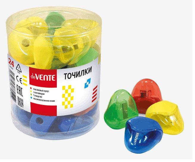 Точилка для карандашей 'deVENTE' 1 отверстие, с контейнером, пластмассовая, овальная, в пластиковой тубе, ассорти