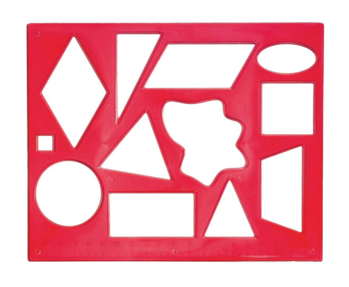 В трафарете вырезаны фигуры разной величины: круг, квадрат, треугольник, прямоугольник, ромб, овал, трапеция.Трафарет позволяет ребенку выучить названия и вид различных фигур, одновременно развивая мелкую моторику и навыки рисования, а также может применяться для оформительских работ.