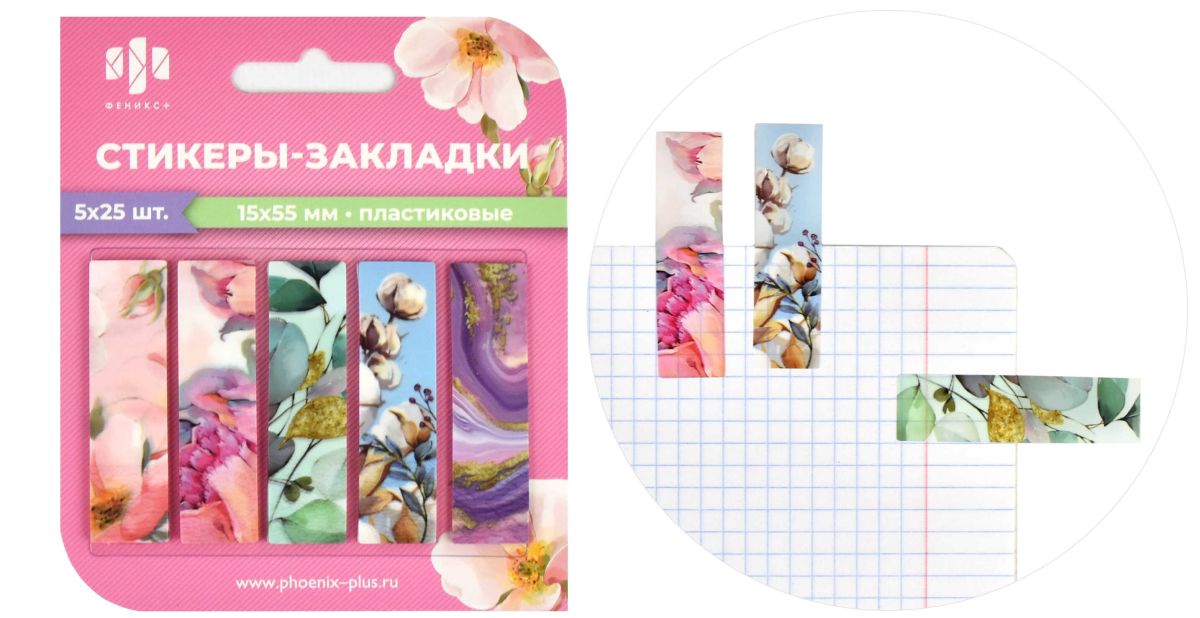 Стикеры-закладки пластиковые, 15х55 мм, 125 шт., арт. 65024 / 48 ПРИРОДА (материал: пластик цвет: голубой, зелёный, розовый; кол-во цветов: 5, кол-во каждого цвета: 25, форма: прямоугольная, декор: полноцветная печать; наличие диспенсера: нет, особенности: подложка прозрачная из ПВХ; индивидуальная упаковка: подложка с европодвесом из мелованного картона + ПЭТ-пакет)