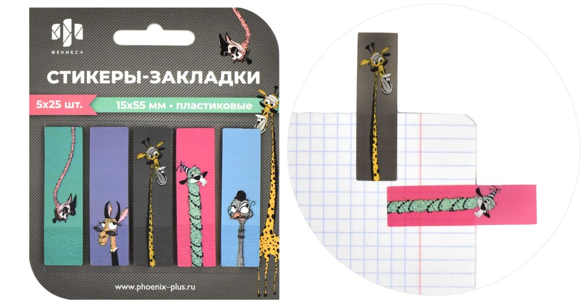Стикеры-закладки пластиковые, 15х55 мм, 125 шт., арт. 65026 / 48 ЗООПАРК (материал: пластик цвет: голубой, зелёный, розовый, серый, фиолетовый; кол-во цветов: 5, кол-во каждого цвета: 25, форма: прямоугольная, декор: полноцветная печать; наличие диспенсера: нет, особенности: подложка прозрачная из ПВХ; индивидуальная упаковка: подложка с европодвесом из мелованного картона + ПЭТ-пакет)