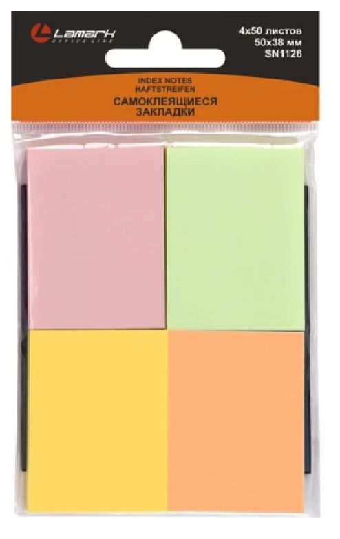 Самоклеящиеся пластиковые закладки Lamark предназначены для маркировки страниц, помогут выделить нужную информацию на листе, организовать цветовое деление разделов. Размер 50x38 мм. 4 цвета пастель по 50 листов.