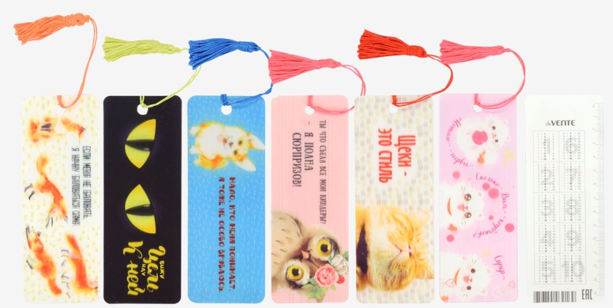 Закладка для книг 3D 'deVENTE' пластиковая, с линейкой и таблицей умножения, 152x57 мм, декоративная кисточка, пластиковый пакет с блистерным подвесом, 6 дизайнов ассорти